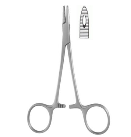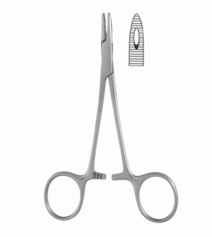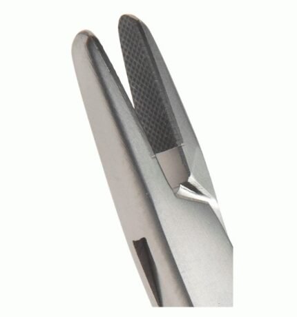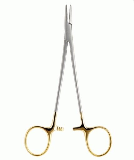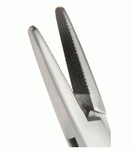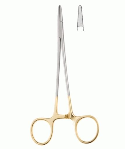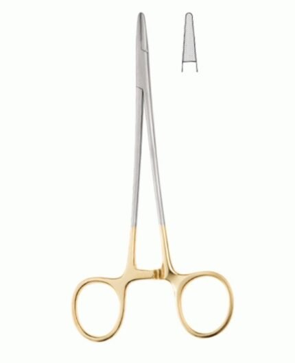 Evo Surgix Bozeman Needle Holder features serrated jaws and optional tungsten carbide inserts that ensure superior precision, control, and a secure non-slip grip. Its S-shaped design makes it ideal for various surgical procedures. The precision-milled, pyramid-shaped teeth provide a dependable hold, while the tungsten carbide jaws offer exceptional durability and extended service life. Handcrafted from high-quality German stainless steel, available in satin finish with gold-plated ring handles.