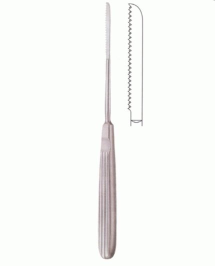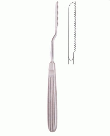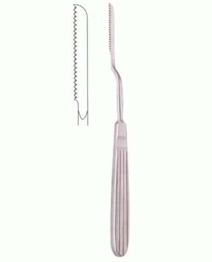 The saw features a long, ergonomically designed handle with outer serrations to ensure a firm, comfortable grip and minimize finger strain during lengthy operations. Its long, slender blade allows easy access to narrow spaces, while the right-angled profile provides excellent reach for lateral nasal areas.